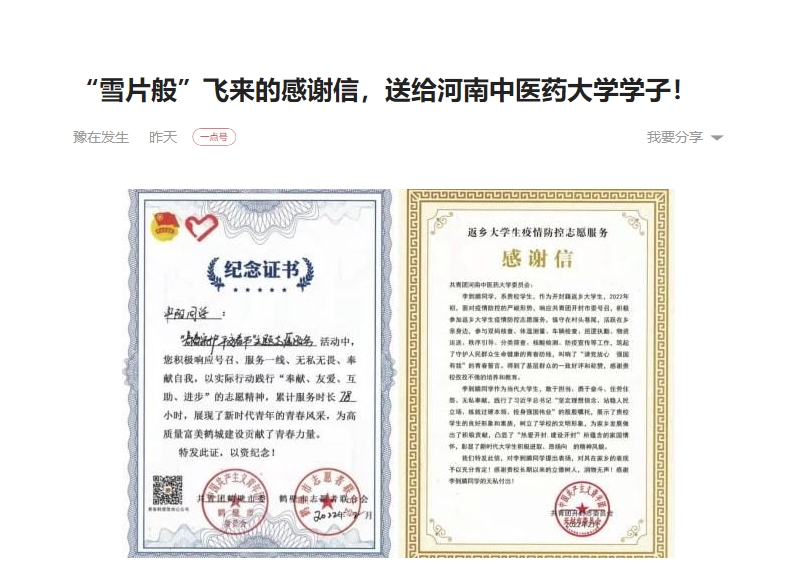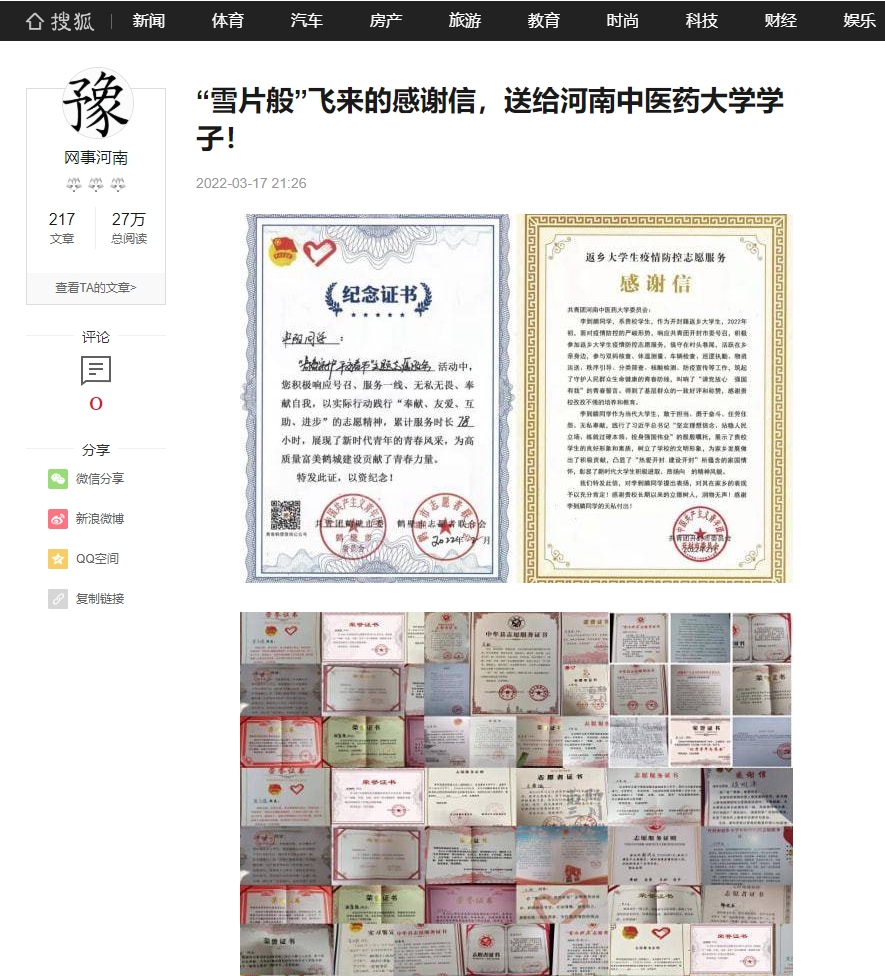 编者按:2022年3月17日,搜狐新闻、今日头条、腾讯内容开放平台、一点号对我校洛阳平乐正骨学院陆续收到多封来自各级团组织、街道、社区的感谢信及表扬信进行报道。