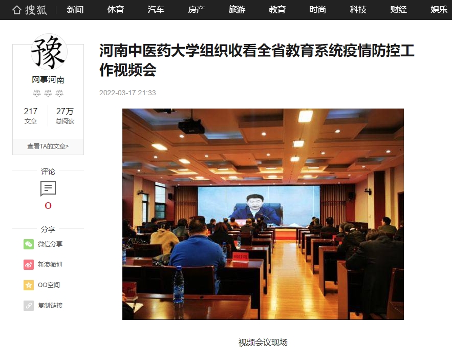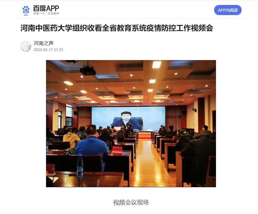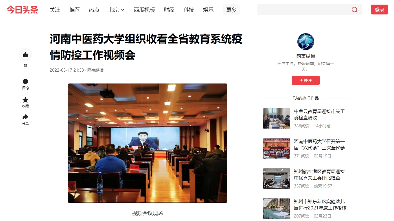 2022年3月17日,今日头条、腾讯内容开放平台、百家号、一点号、搜狐新闻对我校组织收看全省教育系统疫情防控工作视频会进行报道。