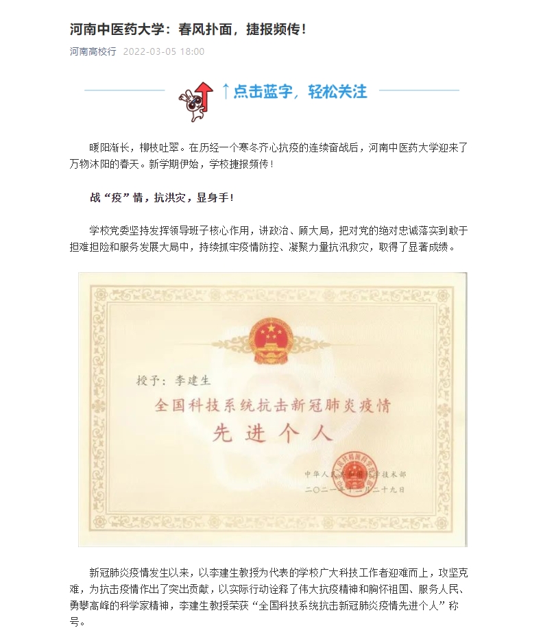 新冠肺炎疫情发生以来,以李建生教授为代表的学校广大科技工作者坚决贯彻落实习近平总书记重要指示批示精神和党中央决策部署,迎难而上,攻坚克难,为抗击疫情作出了突出贡献,以实际行动诠释了伟大抗疫精神和胸怀祖国、服务人民、勇攀高峰的科学家精神,李建生教授荣获“全国科技系统抗击新冠肺炎疫情先进个人”称号。