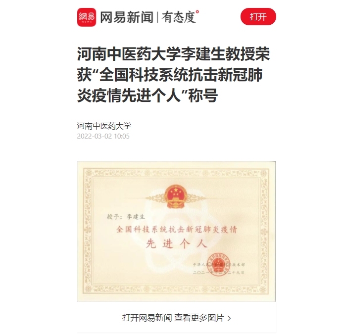 2022年3月2日,网易新闻对我校李建生教授荣获“全国科技系统抗击新冠肺炎疫情先进个人”称号进行报道。