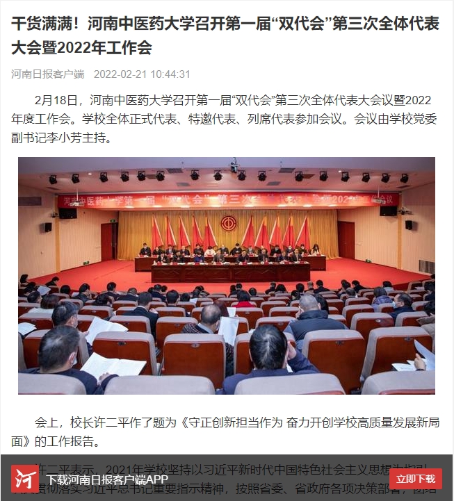 2022年2月21日,河南日报客户端对我校召开第一届“双代会”第三次全体代表大会暨2022年工作会进行报道。