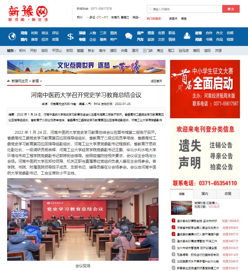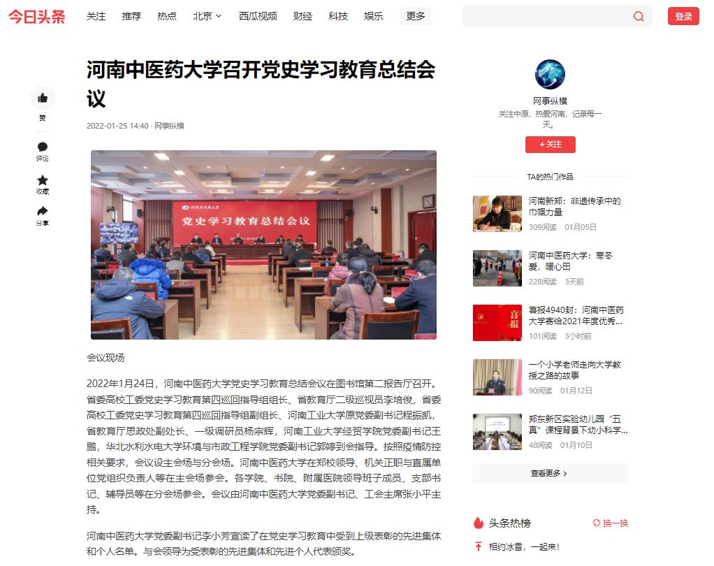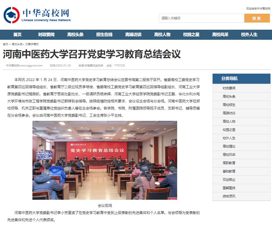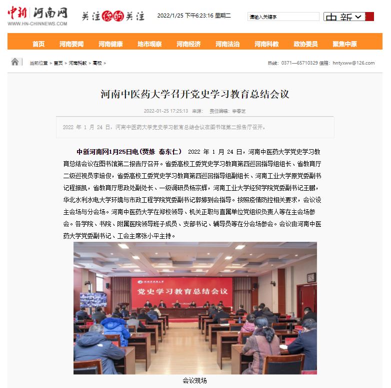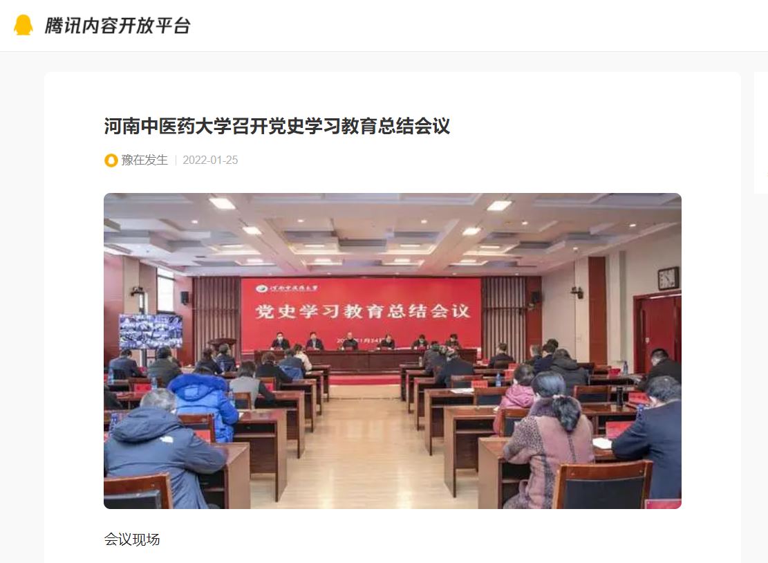 编者按:2022年1月25日,中国教育网、中华网、中华高校网、中新资讯网、河南高校资讯网、新豫网、河南高校行、网易新闻、搜狐号、今日头条、经典中国、中国资讯网、中国信息网、中国商业新闻网、中国梦网、中国创业在线、中国大观网、中国侨报网、中国前沿观察网、中国网讯等多家媒体对我校召开党史学习教育总结会议进行报道。