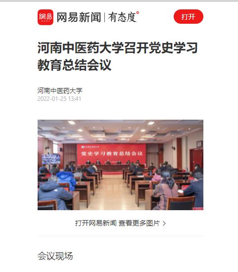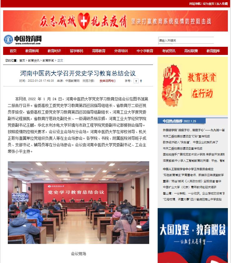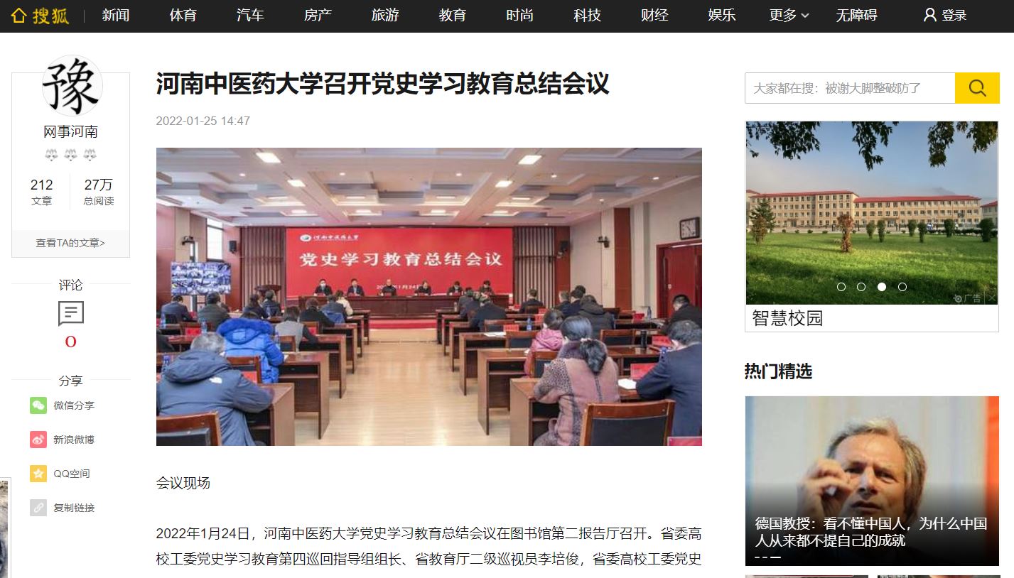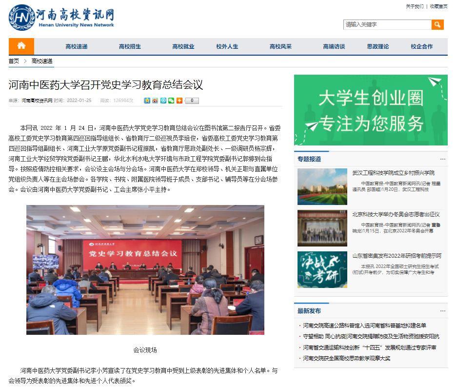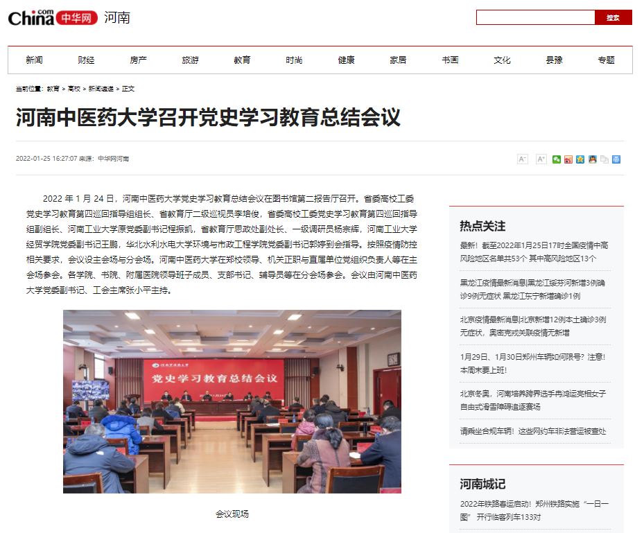 编者按:2022年1月25日,中国教育网、中华网、中华高校网、中新资讯网、河南高校资讯网、新豫网、河南高校行、网易新闻、搜狐号、今日头条、经典中国、中国资讯网、中国信息网、中国商业新闻网、中国梦网、中国创业在线、中国大观网、中国侨报网、中国前沿观察网、中国网讯等多家媒体对我校召开党史学习教育总结会议进行报道。