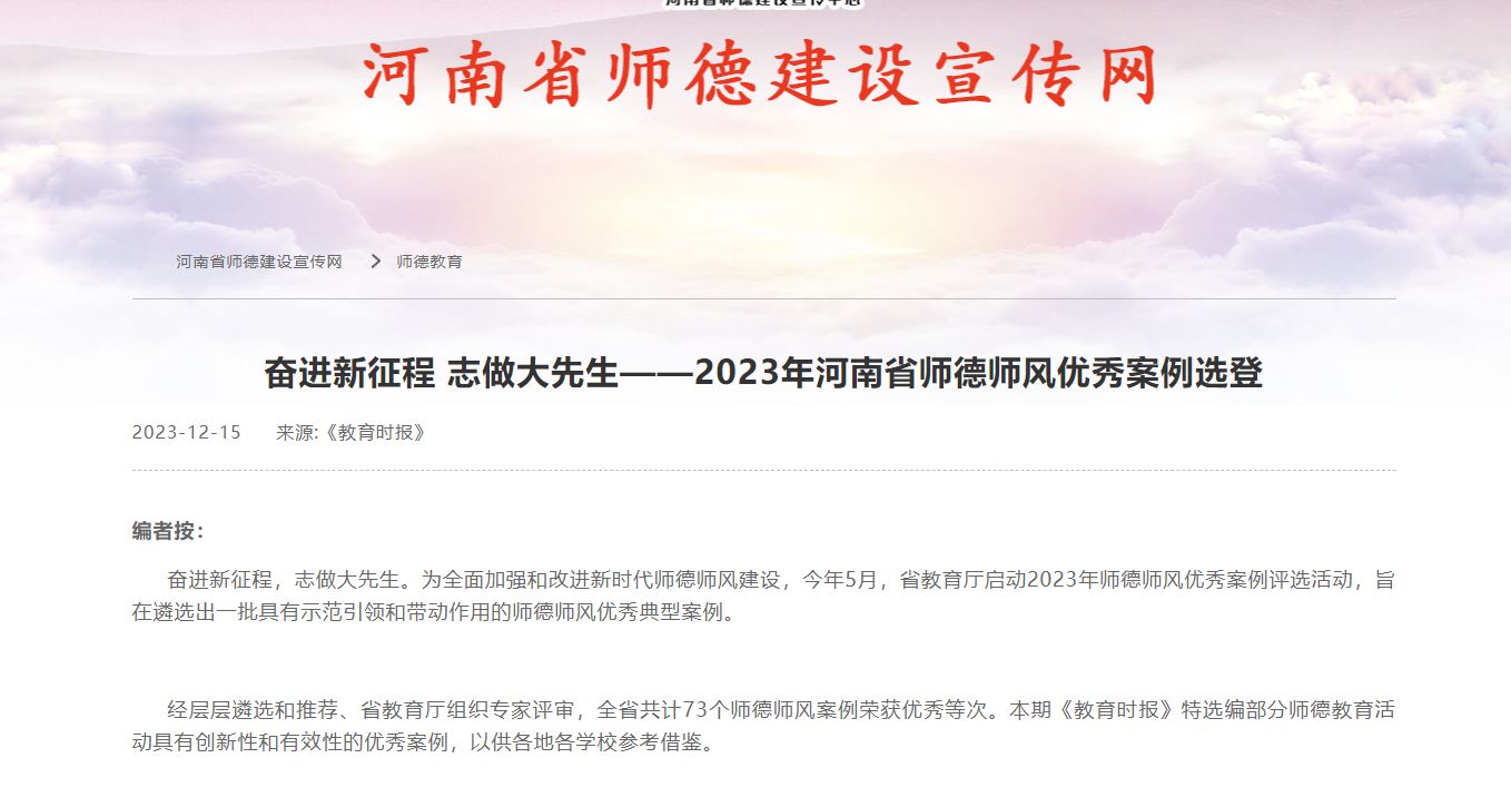 奋进新征程,志做大先生。为全面加强和改进新时代师德师风建设,今年5月,省教育厅启动2023年师德师风优秀案例评选活动,旨在遴选出一批具有示范引领和带动作用的师德师风优秀典型案例。