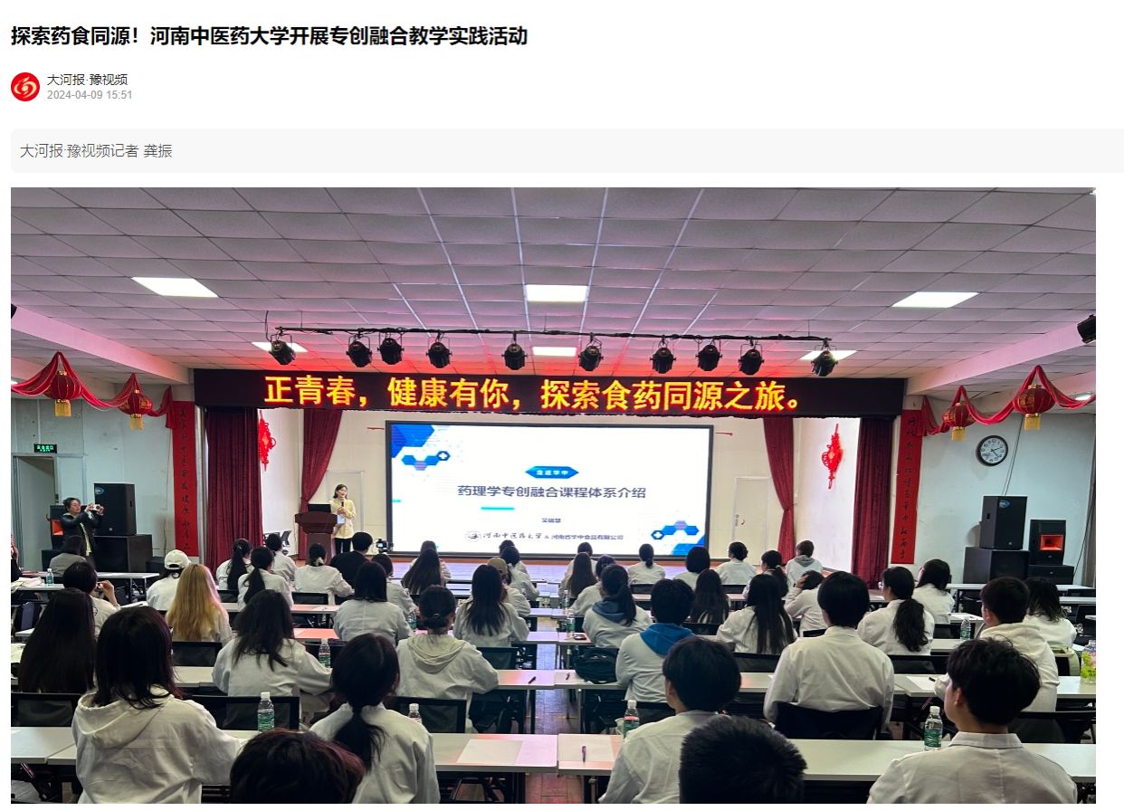 李丹在讲话中表示,《药理学》专创融合课程是在当前“大健康”战略实施的时代背景下,将食疗和医学养生充分融合的多学科交叉教学改革。当前药食同源食品、功能食品的开发是传统食品行业的新的增长点,是该行业新质生产力发展的着力点,该课程也是入选河南省首届”专创融合”的教学改革课程有益,本次课程将医学课堂搬到了工厂,是一次有益的教学探索,是深入贯彻落实党的教育方针,落实立德树人根本任务,是支持在校大学生提升创新创业能力,促进大学生全面发展的有力践行。